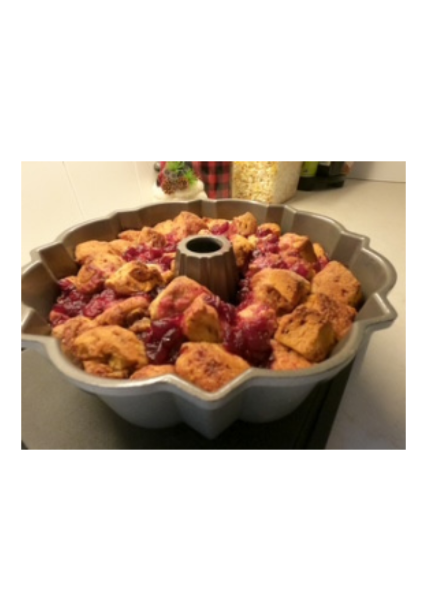 - Layer the pieces into the bundt pan and then layer cranberry sauce over each layer and repeat until all cinnamon roll pieces are in the pan. (I use about 1/2 of the sauce and save the rest you can be more liberal if you love cranberry)